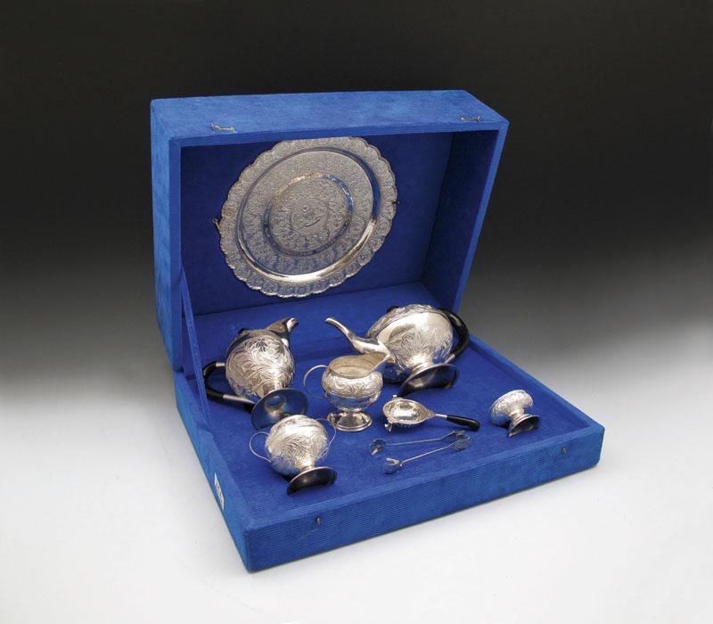 comprising: a circular salver, a tea pot, a hot water pot, a cream jug, a sugar bowl, a tea strainer and stand, and a pair of sugar tongs, in a fitted case.