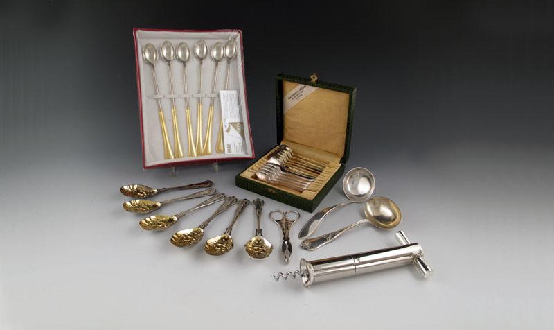 comprising: six Danish silver gilt and poly-chrome enamel coffee spoons, five Belgian spoons, a Dutch ladle, a Belgian ladle, and electroplated items: a corkscrew, a pair of sugar tongs, six fruit spoons and a cased set of six spoons. (qty)