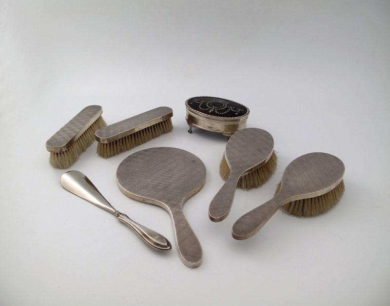 oval form, the hinged cover, inlaid with pique work, husk border, on four bracket feet, plus a five piece silver dressing table set, with good engine turned decoration, London 1966, and a German silver handled shoe horn. (7)