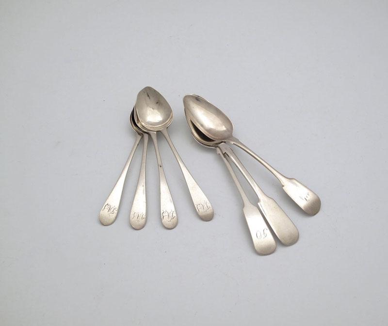 comprising, a Fiddle pattern one, By George Sangster of Aberdeen, with Edinburgh marks for 1867, plus another by William Jamieson, plus one by William Hannay of Paisley, with Edinburgh marks for 1811, plus four old English tea spoons, with maker's mark I.E, approx. weight 20z. (7)