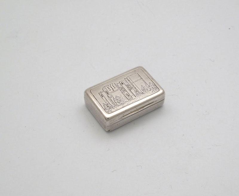 rectangular form, the hinged cover engraved with an unidentified castle, the silver-gilt grille pierced with a bunch of flowers, length 3.8cm, approx. weight 1oz.