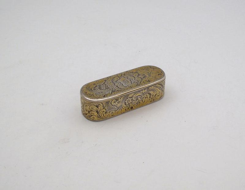 An early-Victorian silver-gilt snuff box, by Alexander Strahan, London 1840, rounded rectangular form, engraved foliate scroll decoration, initialled, length 9cm, approx. weight 3.5oz.