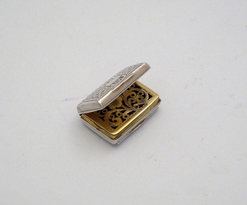 A William IV silver vinaigrette, by John Bettridge, Birmingham 1833, purse form, engraved foliate decoration, the interior with a gilded pierced foliate scroll grille, length 2.6cm, approx. weight 0.2oz.