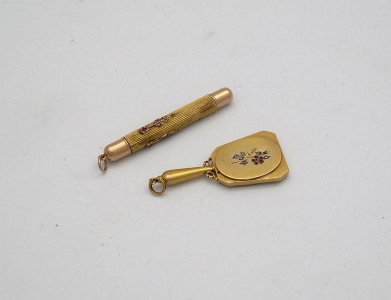 A miniature gold mirror, unmarked, rectangular form, baluster handle, set with jewels, plus a gold pencil, also set with jewels, length 5.5cm and 6cm. (2)