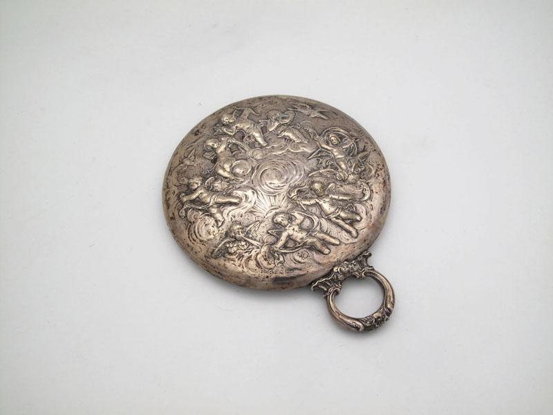 A German silver hand mirror, circa 1900, circular form, embossed cherub decoration, shell capped scroll handle, diameter 15cm.