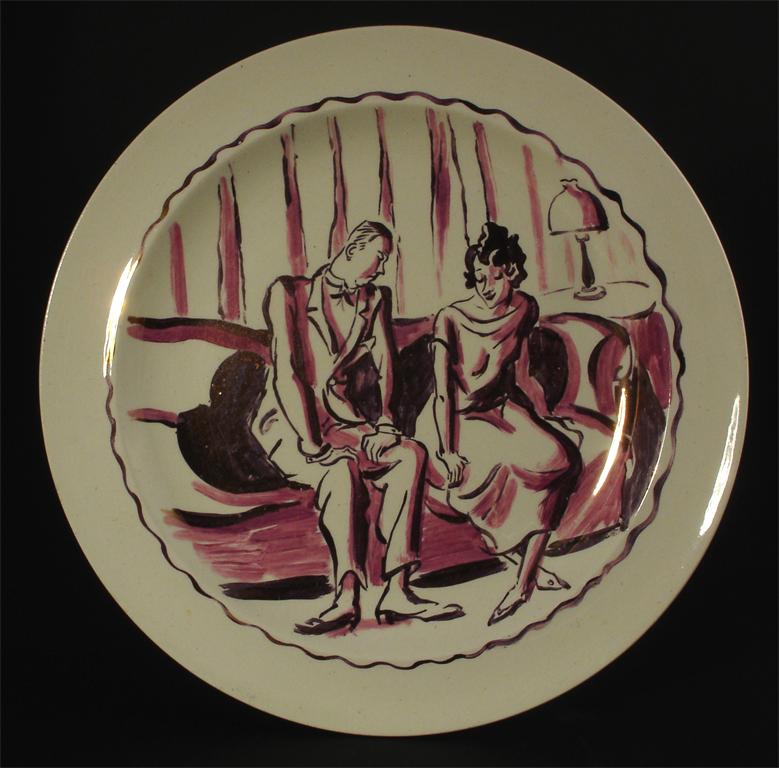 A Wedgwood earthenware plate by Therese Lessore painted in ruby lustre with a young courting...