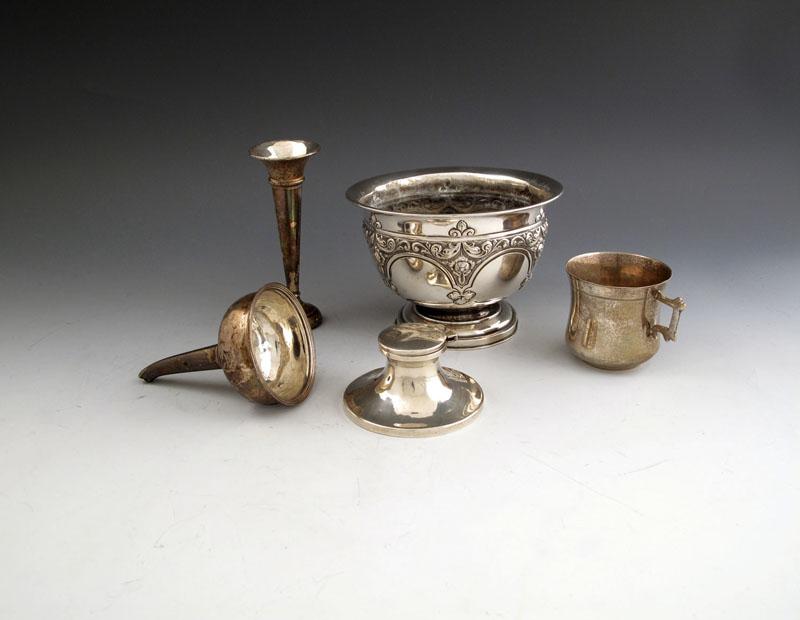 A mixed lot of silver items, various date and maker's, comprising: a silver rose bowl, Birmingham 1911, a wine funnel, a trumpet vase, a capstan inkwell, and an unmarked mug, approx. weighable 8oz. (5)