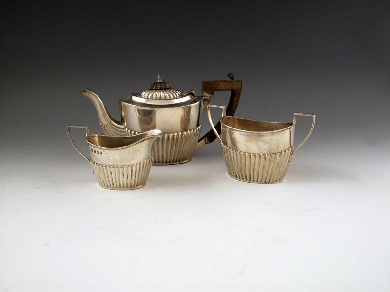 An Edwardian silver three-piece bachelor's silver tea set, by W. Aitkin, Birmingham 1905, oval form, part-fluted decoration, scroll handles, approx. weight 11oz. (3)