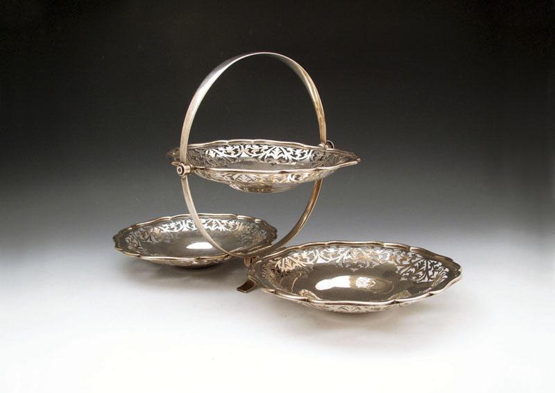 A three-tier folding silver cake stand, by J. Vickery, Birmingham 1912, shaped circular form, pierced foliate scroll decoration, central carrying handle, length 41.5cm, approx. weight 30oz.