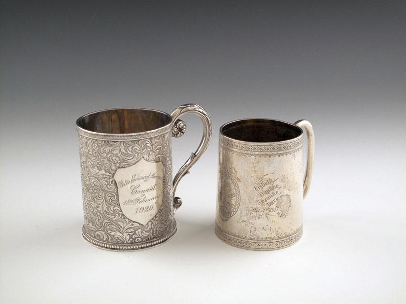 A Victorian silver christening mug, by The Barnards, London 1877, tapering circular form, chased with foliate scroll decoration, later cartouche, plus another Victorian silver christening mug, London 1879, approx. total weight 8oz. (2)