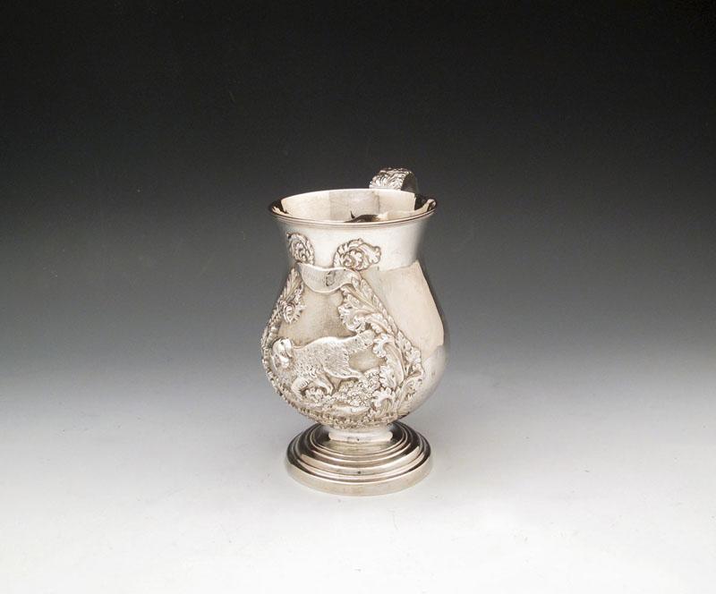 A George IV silver mug, By Spooner and Clowes, Birmingham 1821, baluster form, scroll handle applied with a foliate thump-piece, the front embossed with a scene of a dog in a landscape and engraved 'Thomas Dyke', height 16cm, approx. weight 11oz.