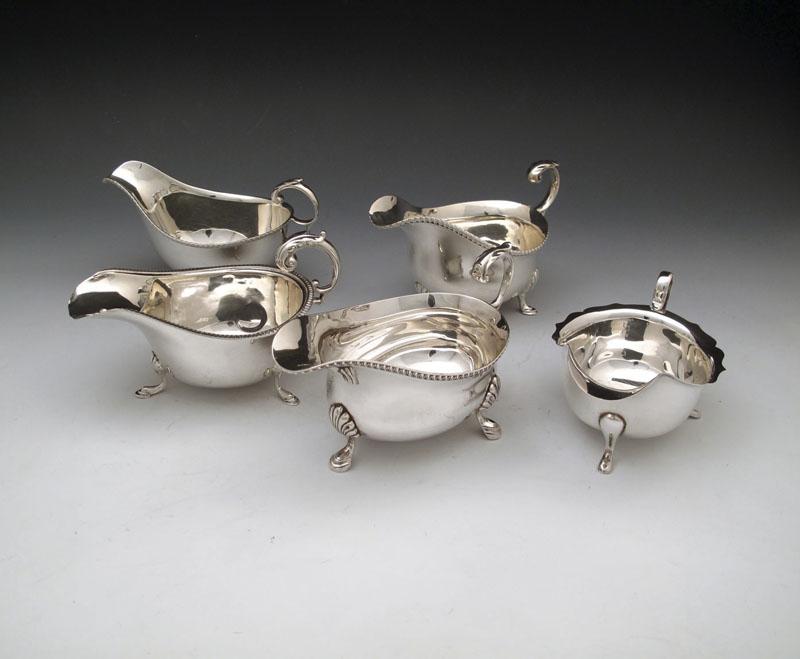 A pair of silver sauce boats, by The Harrison Brothers, Sheffield 1922, oval form, scroll handle, gadroon border on three hoof feet, plus three single sauce boats, of oval form, approx. total weight 20oz. (5)