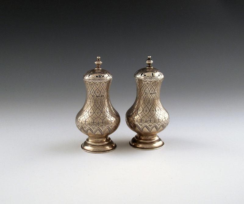 A pair of Victorian silver casters, by J and J Angell, London 1843, baluster form, engraved stylised decoration, knop finials, initialled, on raised circular bases, height 12cm, approx. weight 7oz. (2)
