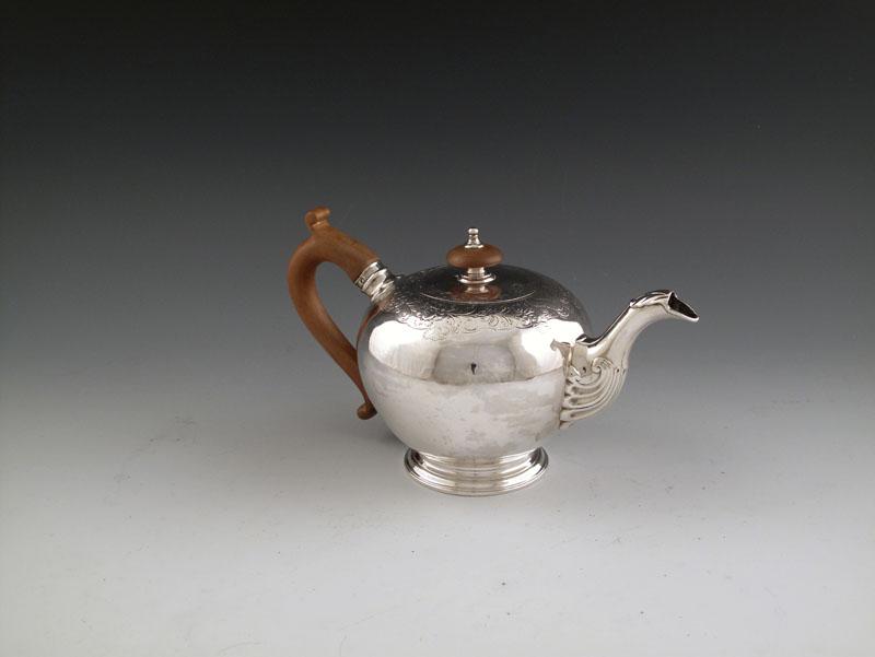 bullet form, scroll handle, flush hinged cover with a knop finial, engraved with a border of foliate scroll and fish scale decoration, on a circular foot, length handle to spout 21cm, approx. weight 12oz.