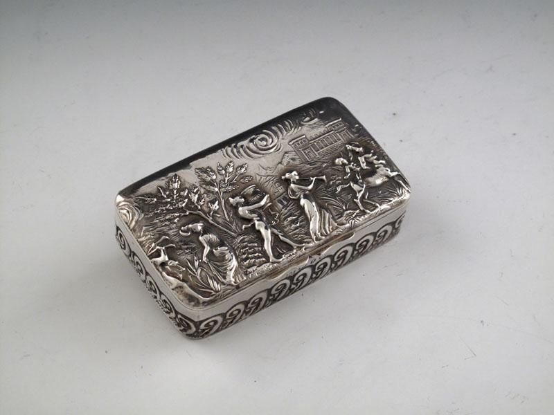 A late-Victorian silver pin box, by T. Hazelwood and Co, Birmingham 1899, rectangular form, embossed foliate and classical figural decoration, length 10.8cm, approx. weight 3.5oz.