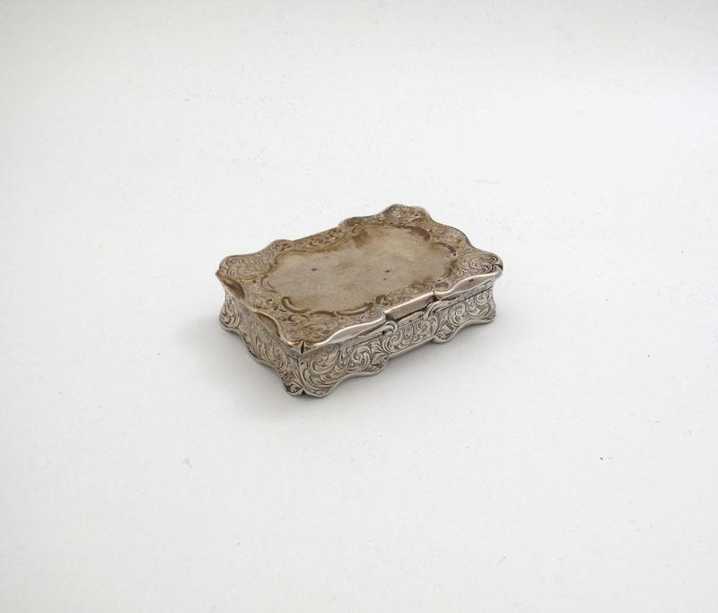 A Victorian silver snuff box, by George Unite, Birmingham 1853, shaped rectangular form, engraved foliate scroll decoration, scroll thumb-piece, length 9.4cm, approx. weight 6oz.