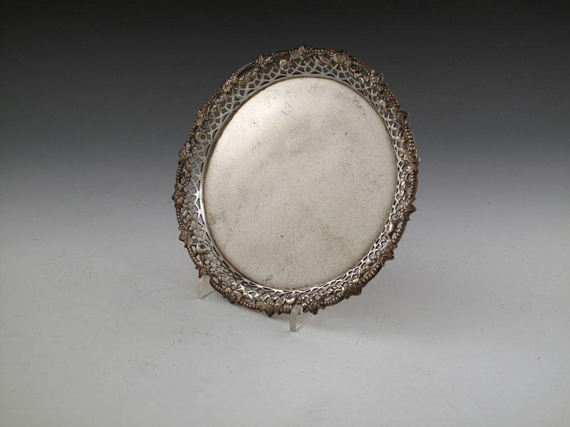 A George III silver waiter, by Ebenezer Coker, London 1773, circular form, the border with pierced fret work and foliate motifs, outer beaded border, diameter 18.5cm, approx. weight 10oz.