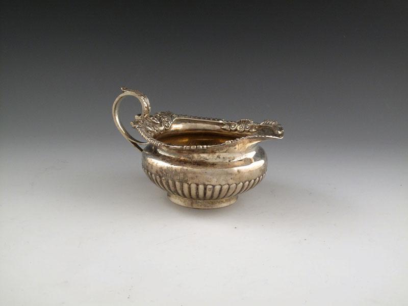 A late-Victorian silver cream jug, by The Barnards, London 1891, circular form, part-fluted decoration, leaf capped scroll handle and gadroon border, on a circular foot, length 16.8cm, approx. weight 10oz.