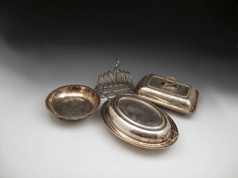 Keswick School of Industrial Arts, an electroplated dish, marked to base KSIA, circular form, spot hammered decoration, rope-work border, on three bun feet, plus two electroplated entree dishes and covers and an electroplated toast rack. (4)