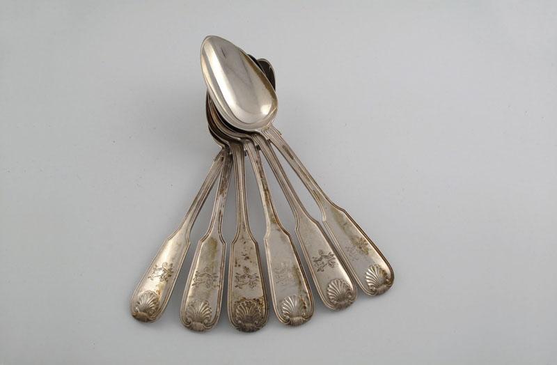 A late-Victorian set of six Fiddle, Thread and Shell pattern tablespoons, by John Samuel Hunt, London 1855, the terminals engraved with two crests, approx. weight 16oz. (6)
