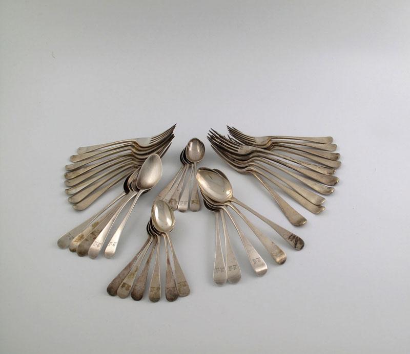 comprising: six table forks, twelve dessert forks, eleven tea spoons, ten dessert spoons, crested, approx. weight 48oz. (39)