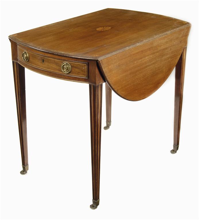 A 19th century mahogany Pembroke table, the oval drop-leaf top with a moulded edge and inlaid marquetry fans, above a frieze drawer to either end, on moulded square tapering legs, brass caps and castors, 28.5in (72cm) h, 32.25 x 41.75in (81.8 x 106cm) open. Restoration and losses.