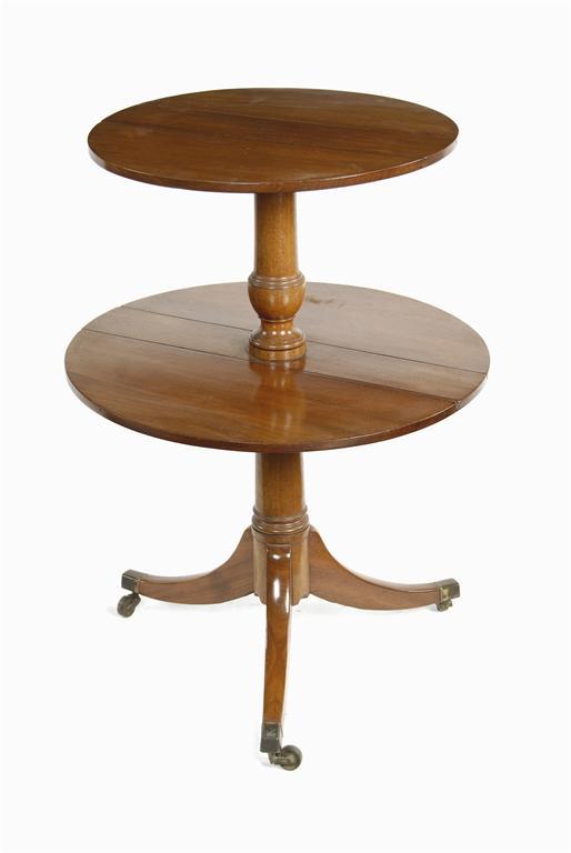 A 19th century mahogany dumb waiter, with two revolving drop-leaf tiers, 31.5in (80cm) h, 23in (58.7cm) dia.