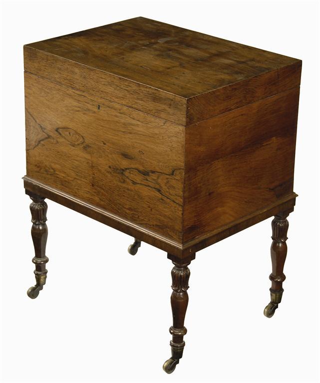 A rosewood Canterbury on stand, the hinged top to an interior with three dipped divisions, on lappet carved legs, brass caps and castors, 26.25in (66.8cm) h, 21.25in (53.8cm) w, 16in (40.6cm) d. Restoration.