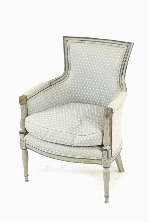 A Swedish painted beechwood armchair, the moulded frame to padded armrests and with turned column supports above a bowfront seat, early 19th century. Wear and chips to frame.
