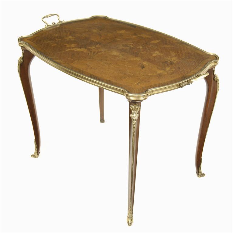 A French marquetry tray table in Louis XV style, the quarter veneered and crossbanded top inlaid flowers, with brass handles and mounts, on cabriole legs, first half 20th century, 25in (63.8cm) h, 35.5in (93cm) w, 20.5in (52cm) d. With a glass top.