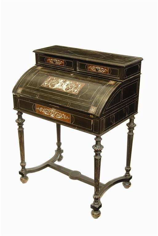 An Italian ebony, ivory and amboyna bureau, inlaid with scrolling foliage, putti and cornucopiae, the raised top fitted with two drawers above a hinged fall enclosing three cedar line drawers, above a further drawer, on an ebonised stand, Milan c.1870, 39in (98.6cm) h, 29.5in (75cm) w, 19in (48cm) d. Veneer loss, wear to legs, losses to mouldings.