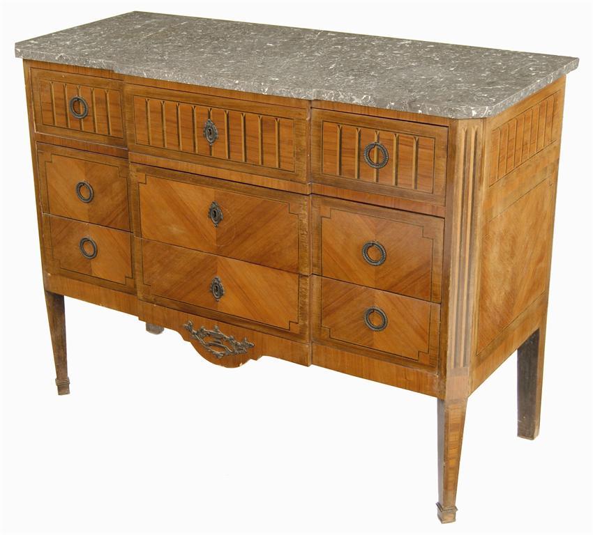 A French kingwood and inlaid breakfront commode, in Transitional style, the mottled grey marble top above three drawers, on square tapering legs, 34.5in (87.3cm) h, 44.75in (113.8cm) w, 19in (48.3cm) d.