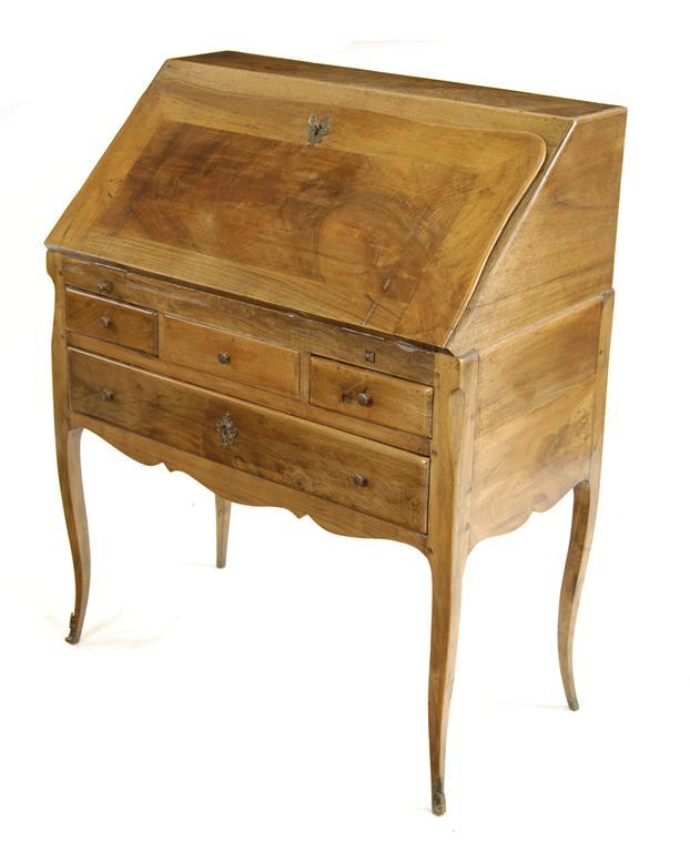 A French walnut bureau de dame, the stepped interior with drawers, pigeon holes, a well and a leather lined surface, 39in (99cm) h, 31.5in (80cm) w, 17.5in (44.5cm) d.