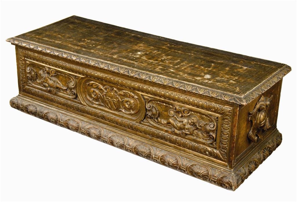 An Italian carved giltwood cassone, the cover with later continuous metal hinge to a baize lined interior fitted for a stereo, the front centred a shield issuing foliage and flanked by reclining male and female figures, applied shields to the sides with a shell and dart base, previously with feet, Venetian, 19.25in (49cm) h, 60.25in (153cm) w, 22.5in (57cm) d.