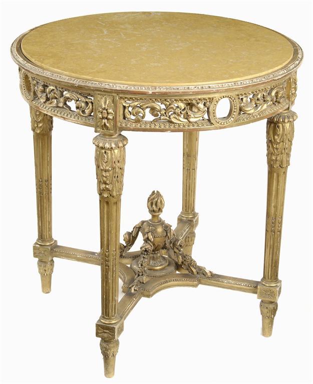 A French giltwood gueridon in Louis XVI style, the circular Siena marble inset top above a pierced and scrolling leaf decorated frieze on acanthus carved and fluted tapering legs, united by an 'X' stretcher centred a flaming urn, second half 19th century, 30.75in (78cm) h, 29in (73.8cm) dia. Some losses.