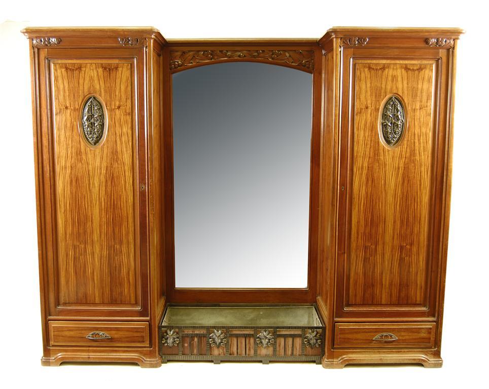 Louis Majorelle. A carved mahogany, kingwood and wrought iron mounted wardrobe, with two cupboards, one with later hanging rail the other with adjustable shelves, above a drawer to the base, flanking a bevelled mirror above a jardiniere with a lift -out liner, the back inscribed in chalk 'Helbard', the side marked 'MAJORELLE NANCY', 78.25in (198.6cm) h, 97in (246.5cm) w, 20.25in (51.5cm) d.
