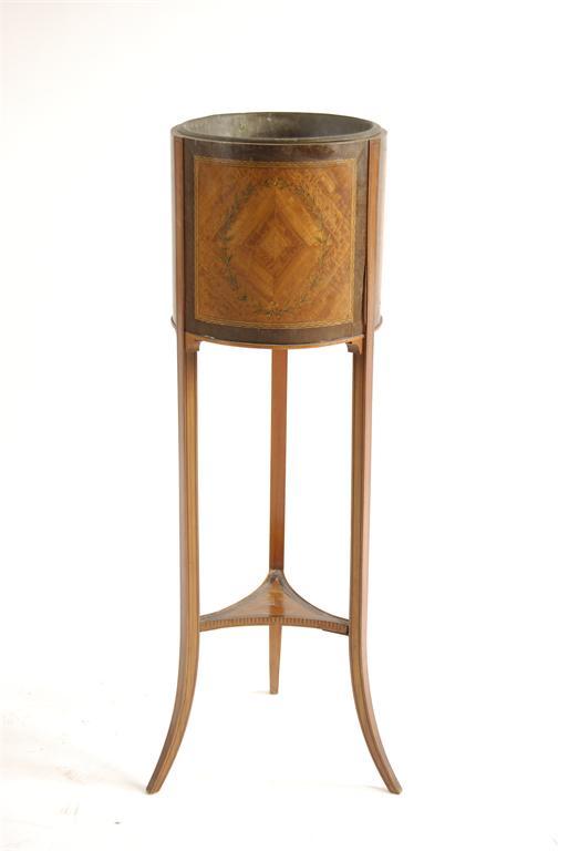 An Edwardian inlaid satinwood and mahogany jardiniere, the cylindrical body with leaf and ribbon inlaid panels, on slender tapering legs with an undertier, 39in (99cm) h,12in (31cm) dia. Damages.