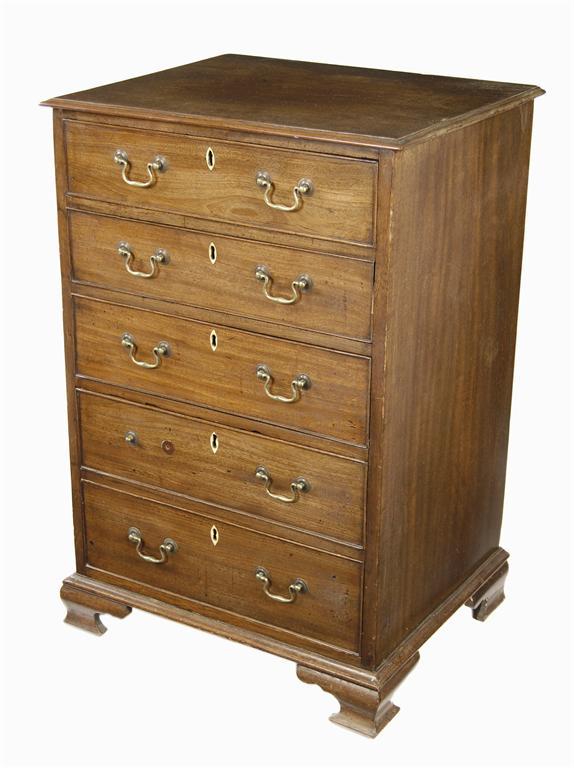 A George III mahogany chest, the moulded edge top above five graduated drawers, fitted replaced brass handles and with ivory escutcheons on shaped ogee bracket feet, 36.5in (93cm) h, 25in (63cm) w, 20in (50.7cm) d.