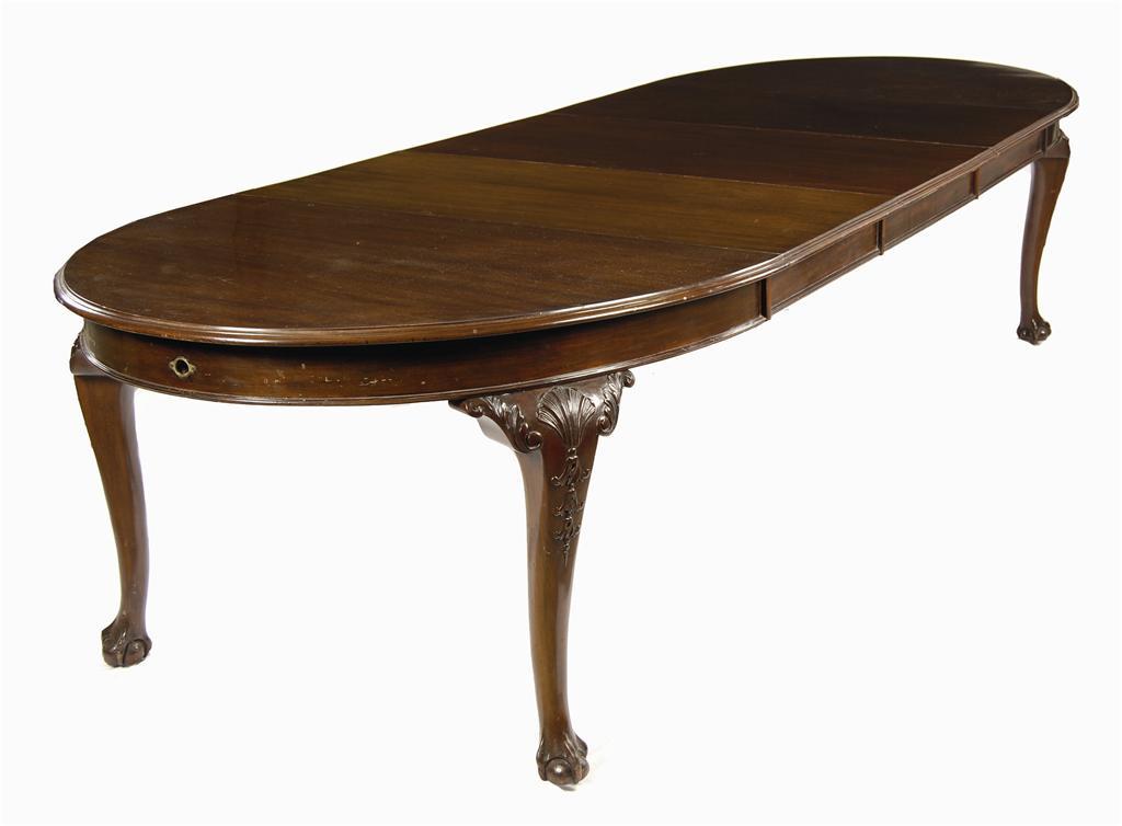 A mahogany extending dining table, the moulded edge top with three additional leaves, on shell and husk carved cabriole legs and on claw and ball feet, with a central support, late 19th / early 20th century, 31in (78.3cm) h, 47.75in (121.3cm) w, 141in (358cm) l. With winder.