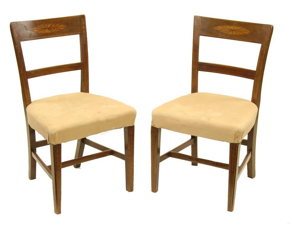 A set of four 19th century mahogany side chairs, each with a curved top rail inlaid a fan the supports with bell flowers. (4)
