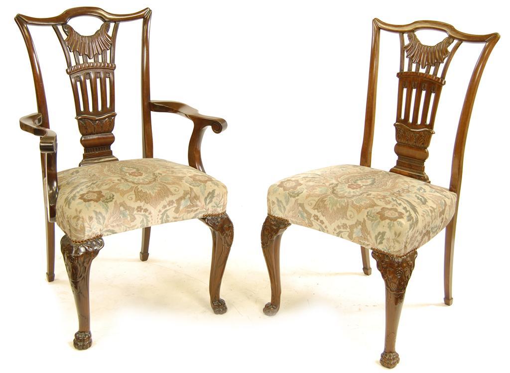 A set of six mahogany dining chairs in 18th century Irish style, each with a carved and pierced splat back above a stuffed over seat, the cabriole front legs with tulips on a diaper ground terminating in paw feet, comprising: a pair of open armchairs and two side, early 20th century. (6)