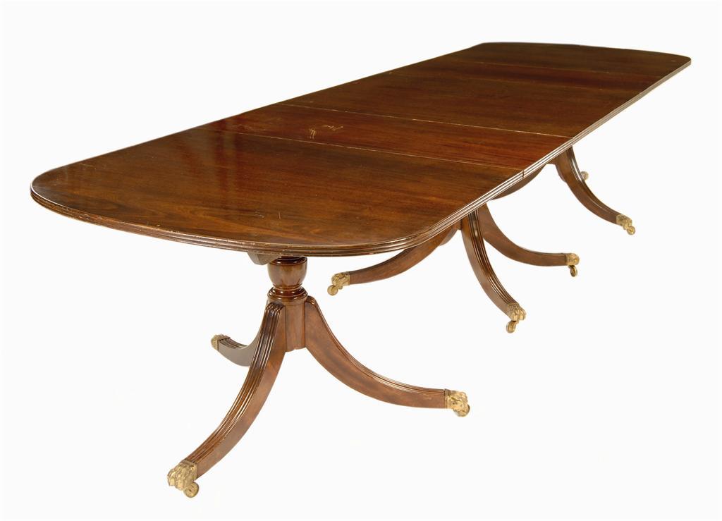A mahogany triple pillar dining table in George III style, the reeded edge detachable top with two additional leaves, on baluster turned stems, downswept moulded legs, brass paw sabots and castors, first half 20th century, 29.5in (74.6cm) h, 43.5in (110.7cm) w, 143.5in (364.5cm) l.