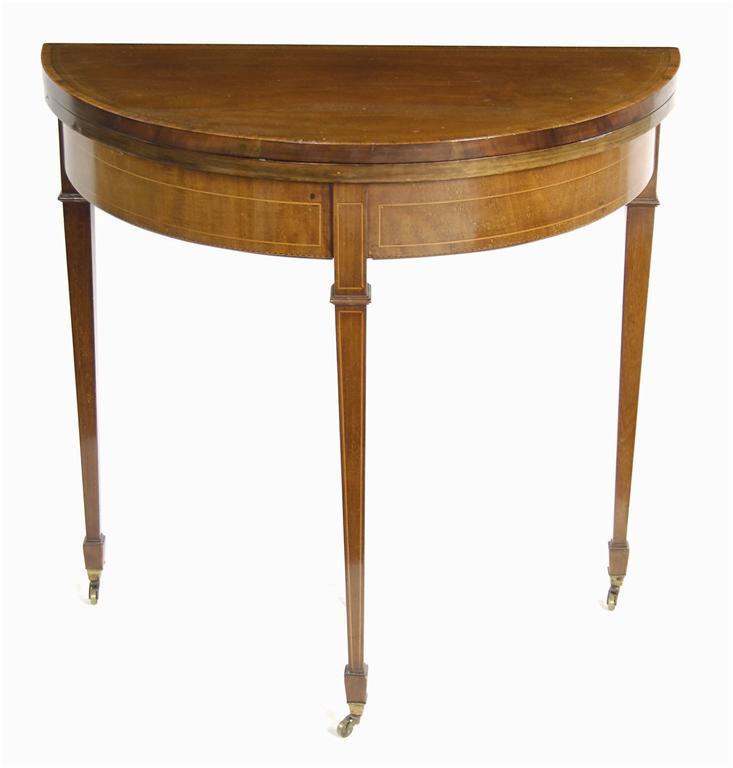 A late Victorian mahogany demi-lune card table, with a rosewood crossbanded top with stringing to a gilt tooled leather and baize surface, the central back leg with a shallow drawer, 29.5in (75cm) h, 30in (76cm) w, 14.75in (37.5cm) d.
