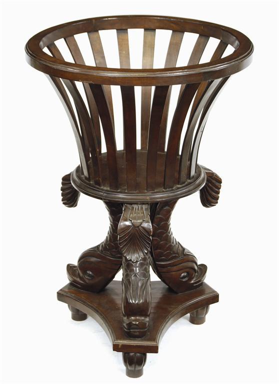 A mahogany jardiniere in Regency style, with carved dolphin supports, 20th century, 28in (71cm) h, 19.25in (49cm) w.