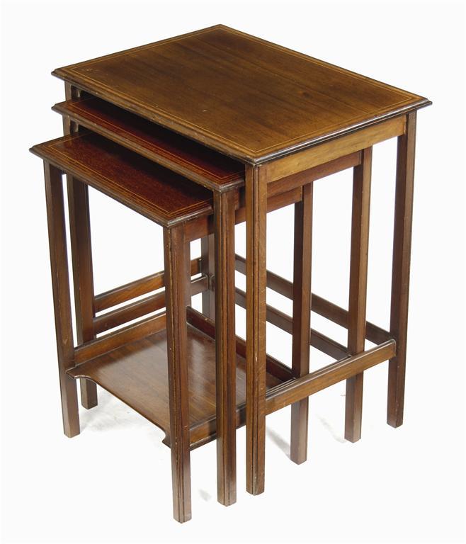 A nest of three mahogany occasional tables, inlaid stringing and kingwood banding, the smallest with an undertier, 20th century, 21in (53.2cm) h, 18in (45.5cm) w, 12.75in (32.5cm) d.