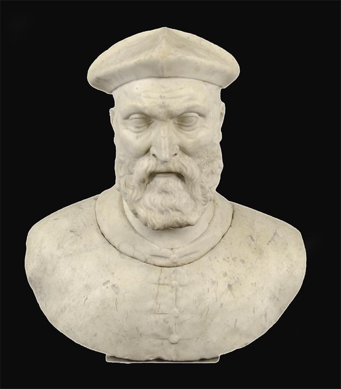 An Italian marble bust of an bearded gentleman, wearing a biretta, 17th/18th century 22in (56cm) h. Nose repaired.