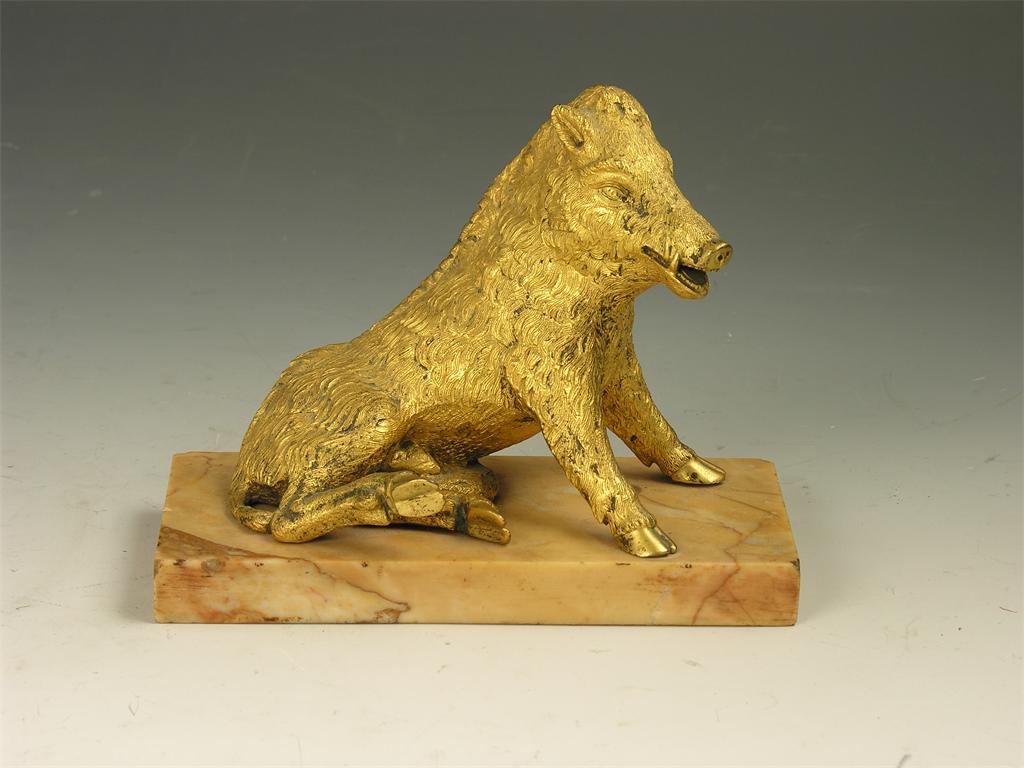 A gilt bronze model of the Medicci boar, after the antique, on a sienna marble base, 4.75in (12cm) h, 6in (15cm) w.