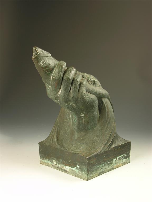A bronze fountain head, with a square base and a breaking wave issuing a hand clasping a fish, 15.5in (39.5cm) h.