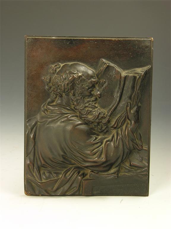 A 19th century bronze relief plaque, of a bearded man reading, 8 x 6.25in (20 x 16cm).