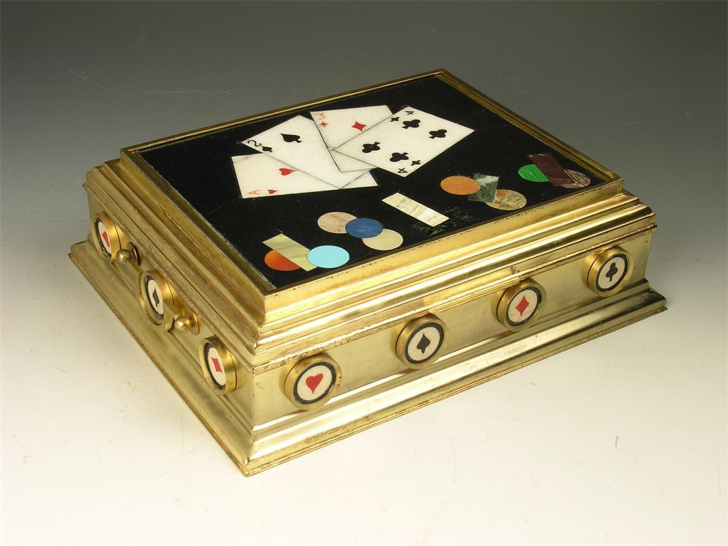 A brass and pietra dura inset games box, of rectangular form with side carrying handles, the lid decorated four playing cards and various counters, the sides with suit rondels, the interior with four compartments, 3.75in (9.5cm) h, 13in (33cm) w, 10.75in (27.5cm) d.